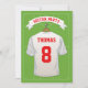 Födelsedagsinbjudningar med fotbollstema med grön fotbollsplan bakgrund, en vit sporttröja med ditt namn och nummer, en fotboll och en modern partsmall