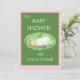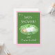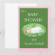 Ett barnkalas inbjudan kort för en ny babyflicka, med en sovande bebis och vit text på en mörkgrön bakgrund, kantad med rosa.