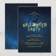 Halloween-inbjudan med fullmåne och fladdermöss på en mörk stjärnhimmel. Inbjudan lyder: Halloween Party
