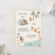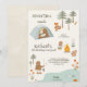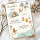 Barnkalasinbjudan med campingtema. Innehåller djur som en räv och björn, tält och lägereld. Texten lyder "Äventyr väntar" och ger evenemangsinformation.