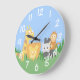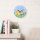 Utformning av tecknad av söta och färgstarka safaridjur bestående av giraffe, lejon, zebra och apa gömmande bland högt gräs. Den här fina klockan är ett perfekt dekorativt biet för att liva ett barn rum. Könsneutrala för både pojkar och flickor. Designad av Rusty Doodle.