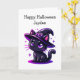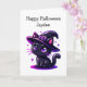 En snygg Halloween-kortsmodell som du kan personalisera! Lägg till barnets namn i området Anpassa. Det här har en söt Kawaii Halloween-svart katt i en häxhatt i lila, vitt och svart. Insidan är en färgsida.