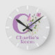 Barn i Bedroom Clock. Konstruktionen har Monogram & Namn med blommor på båda sidor i vatten färg pastel stil. Namn är Charlie. Byt namn så som du vill för alla med ett namn som börjar med C.
