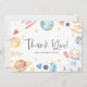 Skicka tack till gästen för att du deltar i ditt evenemang med det här temat för rymden tack för ditt platta kort. Den har vattenfärgsillustrationer som astronaut, raketer, planeter, stjärnor och måne. Anpassa genom att lägga till namn och meddelande. Det här temat är ett tack för ditt kort för perfekt till babyduschar och barns födelsedag party.