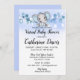 Virtuellt inbjudningskort för babydusch med en söt blå elefant med baby blue löv och vit ljus-effekt för en underbar babydusch för elefanttemat.