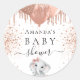 För en babydusch, fira en flicka. En vit chic bakgrund. Dekorerad med ro guld, rosa faux glitter droppar, färgdroppar, glitter droppar, ballonger och en söt liten elefantflicka från baby. Anpassa och lägga till namn i mamma