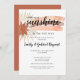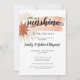 En babyduschinbjudan från Boho stil med en vattenfärgad regnbåge med guld glitter-strålar och en liten solstråle på temat. En djärv bohemisk stil med färg.