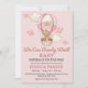 Tur illustration av en björn i baby i en rosa ballong med moln och fåglar. Bakgrunden är blekens rosa