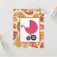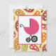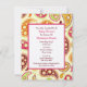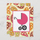 En flickduschinbjudan med en illustration av en shock rosa-baby-vagn över en bakgrund av rosa, grönt, orange, guld och burgundypaisley. Anpassa texten på baksidan med information om tillfälle.