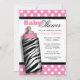 Snyggt Baby Shower-inbjudningar designade med vit polka dots över rosan och med en flaska i zebra tryck baby.