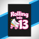 Denna skridskofestdesign är perfekt för en rullskridskoåkningfest eller födelsedagstema för en 13-åring. Om födelsedagsflickan eller födelsedagsbarnet älskar att åka rullskridskor kommer de att ÄLSKA denna skridskofestdesign! Den har en retroinspirerad "Rullar in i 13" födelsedagsfras med cool rullskridskografik med regnbågar och stjärnor som är rolig och unik. Rolig rullskridskoåkningfestdesign för en 13-årsdag!