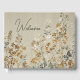 Denna gästbok har ett eteriskt, ängsinspirerat landskap utfört i en delikat akvarellstil. Stjälkar av vilda blommor och klöverliknande blad sträcker sig uppåt mot en varm linnetexturerad bakgrund och skapar ett taktilt, tygliknande utseende.
