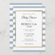Med en söt dammig blå och vit rand-bakgrund har den här eleganten babyduschen, sprinkeln eller par-duschinbjudan en elegant faux-foil-gräns som ger dig information som är angiven i chicens typografi. Designad av Thisisnotme©