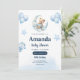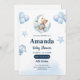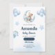 Fira att en liten stjärna har kommit med den här drömmande babyduschinbjudan med en söt nalle som vilar på ett halvmånsfärande måne, omgiven av hängstjärnor, fluffa moln och milda blå ballonger.