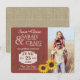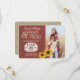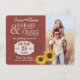 Rustik röd ladutrustning för landsbygdens spara datum med foto accentuerat med solrosor och jutedesign på baksidan. Anpassa texten efter önskemål och lägg till en webbplatsadress för bröllopet eller annan information på baksidan.