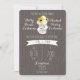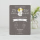 En bröllopsinbjudning med en illustration av en mason burk fylld med daisy och svarta ögonfransar mellan bruds och Grooms namn. Text och formgivning är vita, bakgrunden är hårfäst.