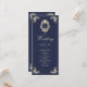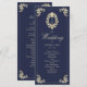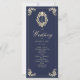 Elegant barock navyblått och guld bröllopsprogram med vintage viktoriansk monogram, utsmyckade ramdetaljer och klassiska utsmyckningar. Perfekt för traditionella bröllop, detta dubbelsidiga ceremoni-program innehåller ordning för ceremonin och detaljer om bröllopsfesten. Koordinerar med det fullständiga navy- och guld-barockbröllopspaketet för en tidlös, lyxig look.