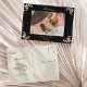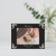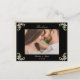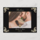 Lyxig svart och guld barock bröllop tackkort med eleganta hörnslingor och utrymme för ett personligt foto på framsidan. Baksidan har en klassisk vykortlayout med redigerbar text för ditt tackmeddelande, returadress och leveransområde. Ett sofistikerat sätt att uttrycka tacksamhet till dina gäster medan det matchar din svarta och gyllene bröllopsserie.