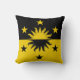 "Per fess sable och eller, en sol mellan sex mullets i Anno, omvänd." Populace-bricka för Eskalyas barony i Society for Kreativ Anakronism. Baksidan av kudden är ett medeltida mönster i samordningen av färg.