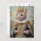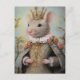 A diminutive mouse, positioned centrally within a vertical portrait frame, is the charming subject. The mouse has grey/brown fur, small features, and wears an elaborate gold crown and a lavish white ruffled collar. It is dressed in a dark blue/green coat adorned with gold trim and a prominent red sash, indicative of Baroque royal fashion. The background is dark, rich, and features subtle patterned embellishments. The artwork is rendered in a highly detailed, painterly style, utilizing soft lighting to emphasize the textures of the fur and the intricate regalia. The overall atmosphere is elegant, unique, and whimsical.