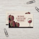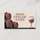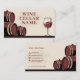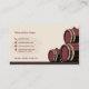 Ett affärskort med en illustration av tunnor och ett vin-glas i beige och burgundy färg. Den skulle kunna användas för en källarbutik i vin, en vinproducent, en sommar osv. Det inkluderar öppettider på baksidan.