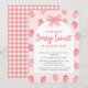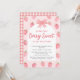 Den här söta jordgubbsinspirerade förlossningsfestinbjudan för flickor har akvarell-jordgubbar och rosa typsnitt på en välvd bakgrund. Baksidan är dekorerad med ett rosa rutigt gingham-mönster. Den lyder "Någon som är riktigt söt är på väg" och är lätt att anpassa. Original akvarell © Michele Davies