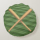 Runt dekorativ kudde med en baseboll på framsidan och en baseboll fält och korsade fladdermöss på baksidan.