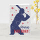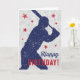 Basebollens temakort Grattis på födelsedagen med en mörk blått silhuett av en pojke som håller fladdermus omgiven av röda stjärnor på en sliten boll.