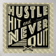 Baseball är Slå och sluta aldrig skriva ut. Texten lyder: Hustle, Slå och Avslutar aldrig, med en korsad baseboll och en fladdermöss.
