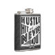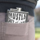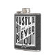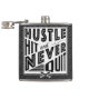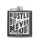 Baseball Hustle, Slå och sluta aldrig med höftkolv. Texten lyder: Hustle, Slå och Avslutar aldrig, med en korsad baseboll och en fladdermöss.