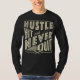 Baseball/softball, långdragna t-shirts, finns i stilar för manar, kvinnor och barn. Texten lyder: Hustle, Slå och Avslutar aldrig, med en korsad baseboll och en fladdermöss.