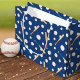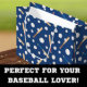 I roligt visar baseboll och fladdermus mönster sportutrustningen i mönster på mörk blått. Det är ett underbart tillägg till en födelsedag, jul eller annan helgdag av en liten pojke eller flicka.