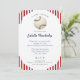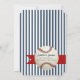 Vintagen inspirerade och blåstrimlade mönster baseballtemabildsinbjudan med basebolldesign och registerinformation på baksidan.