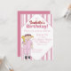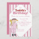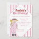 En liten flicka i en enhetlig rosa baseball och baseballmössastativ med fladdermöss och boll räcker in mot en pinstriped bakgrund på denna födelsedagsfest inbjudan. All text kan lätt skräddarsy för att passa dina egna behov. Från mitt digital-skapade original avbilda.