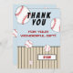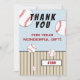 Baseboll tema födelsedag tackkort med tackmeddelande, namn och basebollbollar. Kortet är i vitt, rött, blått och svart färgschema. På baksidan av kortet finns basebollbollar på en blå bakgrund. Anpassa kortet med barnets namn. Du kan ändra eller radera texten. Bra för barn som älskar baseboll och sport.