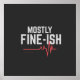 This design humorously captures the feeling of being "just okay." The main text, "MOSTLY FINE-ISH," is presented in bold, strong typography, contrasting with the underlying sentiment. A key graphic element is the flatline-to-spike heartbeat (ECG/EKG) line in red, visually representing a fluctuating or uncertain emotional state. Below the line, a witty subtitle reads: "The art of low-stakes ambiguity." It's a relatable and subtly sarcastic design perfect for anyone who prefers to keep their feelings a little ambiguous.