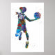 Vibrant watercolor-style artwork depicting a teenage boy playing basketball. The dynamic pose and colorful splashes capture the energy and motion of the sport. This athletic poster design highlights youthful enthusiasm and makes an eye-catching addition to sports-themed wall decor.