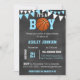 Inbjudningskort för babyduschkort för basketboll i fantastisk. Chalkboard-bakgrund med basketboll En pojke. Blå och vit färg. Redigerbara mallkort så att du kan lägga till information. Hämta matchande klistermärken för dina presenttjänster.