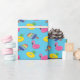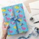 Sammanfogningsgåvor i stil med detta pappra omslag som har en mönster av ljusa färgad bassäng flyter eller bassäng rör i form av en flamingo, en ananas och en popsikel mot en ljusblå bakgrund.
