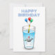 Födelsedagskort med en söt illustration av lite val. Valet bär en röd och vit stripe party-hatt och har startat den födelsedagsfest som tar ställe i ett fyllt vatten-glas.