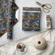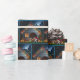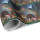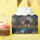 En basset som har en julhatt inuti en trädoghouse försedd med färgstark julklapp ljus