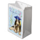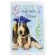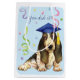 Gratulerar till student med en gåva i en väska med en söt, lycklig Basset Hound student med en pantpapp i en fjäder av konfetti.