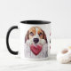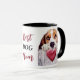 "Bästa HUND Mamma" deklarerar denna söta mugg i mitten. Bilden på varje sida är av en bedårande Beagle som tittar över ett trästaket och erbjuder ett glitterigt rött hjärta. Perfekt för Mors dag eller hennes födelsedag! All text är anpassningsbar, så du kan ändra den för Pappa på Fars dag också.