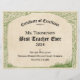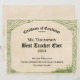 En vacker 8 1/2 x 11 Certifikat för excellens för den bästa läraren någonsin. Designad med ett skogsstilstryck i träsnitt. Detta certifikat är personligt anpassat med lärarens namn och år, tillsammans med elevens namn, klass och skola. Lägg till din egen ram (eller inte) och detta prisvärda certifikat blir en gåva som din barns lärare kommer att värdesätta i många år framöver.