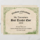 Ett vackert 8 1/2 x 11 certifikat för excellens för den bästa läraren någonsin. Designat med en skogsstil träsnittstryck. Detta certifikat är personligt anpassat med lärarens namn och år, tillsammans med elevens namn, betyg och skolans namn. Lägg till din egen ram (eller inte) och detta prisvärda certifikat blir en present som din barns lärare kommer att värdesätta i många år framöver.
