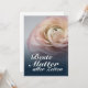 Närbild på en rosa ros på blå bakgrund och morsdag- eller födelsedagsgratulationer. Resten av kortet kan utformas fritt.