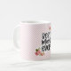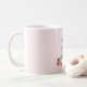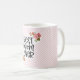Mors dag mugg med bästa Mamma någonsin-citat omgivet av blommigt buketter mot en strimlad rosa.