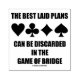 Om du förstår hur bron fungerar kommer du att njuta av bron humor gummi frimärke med en bryggbros som säger "de bästa Laid Plans can be Discarded in the Game of Bridge". Kommer med det fyra kortet kostym. Få andra att göra en dubbla på vad som pågår i bron med en dos ljud humoristiska bron som råd med detta gummi frimärke!