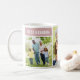 En vacker fotokaffemugg med ett dammigt rosenfärgat banderoll med texten Bästa mormor, tre favoritfamiljefoton och ett personligt Vi älskar dig-meddelande med barnbarnens namn. All text, foton och accentfärgen är helt redigerbara — en vacker morsdags- eller födelsedagspresent från barnbarnen.