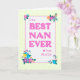 Ett söt Mors dag-kort för BÄSTA NAN NER. Utformningen har en gult som kontrollerar gingham gräns runt ord, "To the BEST NAN EVER from All of US, in magenta rosa lettering on a mild textured white bakgrund. Det finns starka kluster av blommor med flera färgader i hörnen och ett litet rosa i magentan. Det inre meddelandet kan anpassas eller tas bort om du vill.